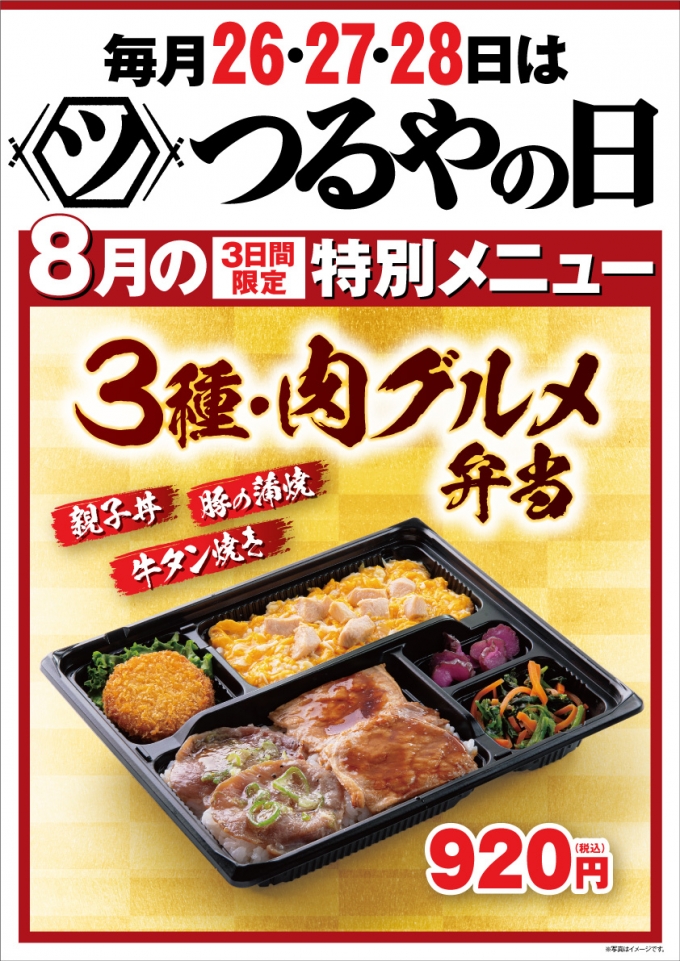 毎月26・27・28日はつるやの日! 8月は「3種・肉グルメ弁当」が登場! 2025.08.22 8月は、「3種・肉グルメ弁当」がつるやの日で登場! つるやの日の3日間限定 920円(税込み)で提供します。 つるやの日 限定品ページ