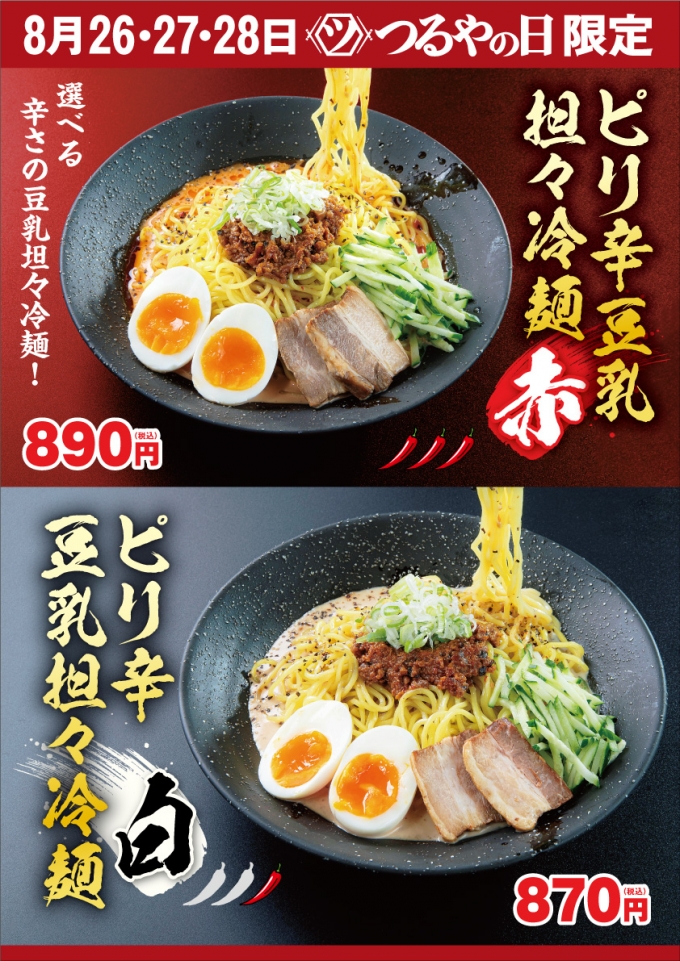 毎月26・27・28日はつるやの日!8月は「ピリ辛豆乳担々冷麺(赤)と(白)」がイートインに登場! 2025.08.22 8月は、「ピリ辛豆乳担々冷麺(赤)」「ピリ辛豆乳担々冷麺(白)」がつるやの日イートインで登場! つるやの日の3日間限定 でお食事提供します。(お持ち帰りできます。) ※弓削店は除きます。 つるやの日 限定品ページ