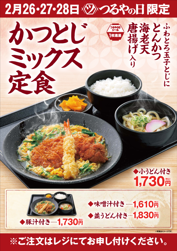 毎月26・27・28日はつるやの日!2月は「かつとじミックス定食」がイートインに登場! 2026.02.21 2月は、「かつとじミックス定食」がつるやの日イートインで登場! つるやの日の3日間限定 でお食事提供します。 ※弓削店は除きます。 つるやの日 限定品ページ