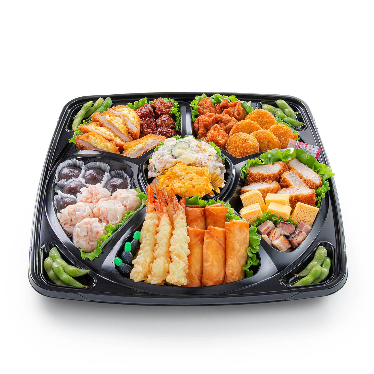 【食材】海老フライ・厚切りハムカツ・農家のベーコン・唐揚げ王の唐揚げ・水まんじゅう・だし巻き玉子・とんかつ・ヒレカツ・枝豆・ミニコーンコロッケ・オイスター焼鶏・鶏肉だんご(黒酢あん)・ほくほくサラダ・ポテトサラダ