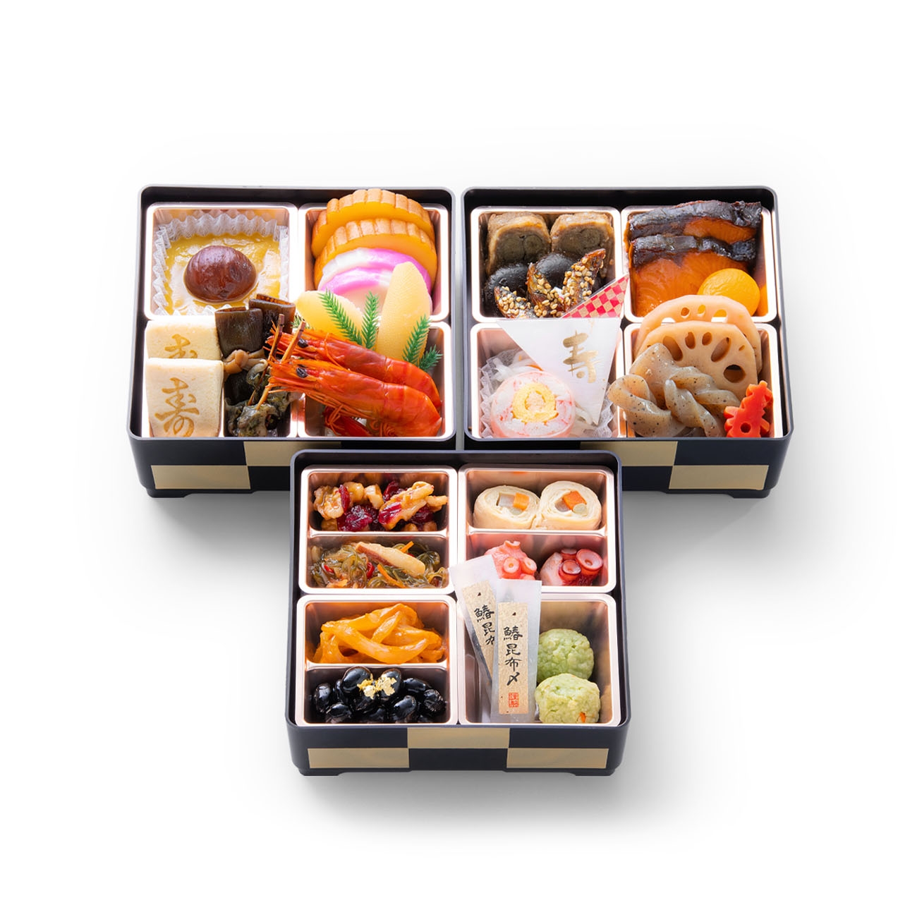 【壱の重】海老の旨煮/味付数の子/伊達巻/市松かまぼこ/鳴門芋きんとん/栗甘露煮/寿高野煮/あかにし香草松葉/昆布巻【弍の重】鰤の照焼き/わかごま/牛肉八幡巻き/れんこん煮/手綱こんにゃく煮/しいたけ煮/寿人参 /紅白生酢/カニ水車巻/杏子さわやか煮【参の重】鰆昆布〆金箔紙包/甲いかうにかにみそ/たこ梅じそ風味/いか刺し入りゴボウ昆布醬油漬け/クランベリーくるみ/湯葉三色/たら野菜つみれ/黒豆金箔飾り