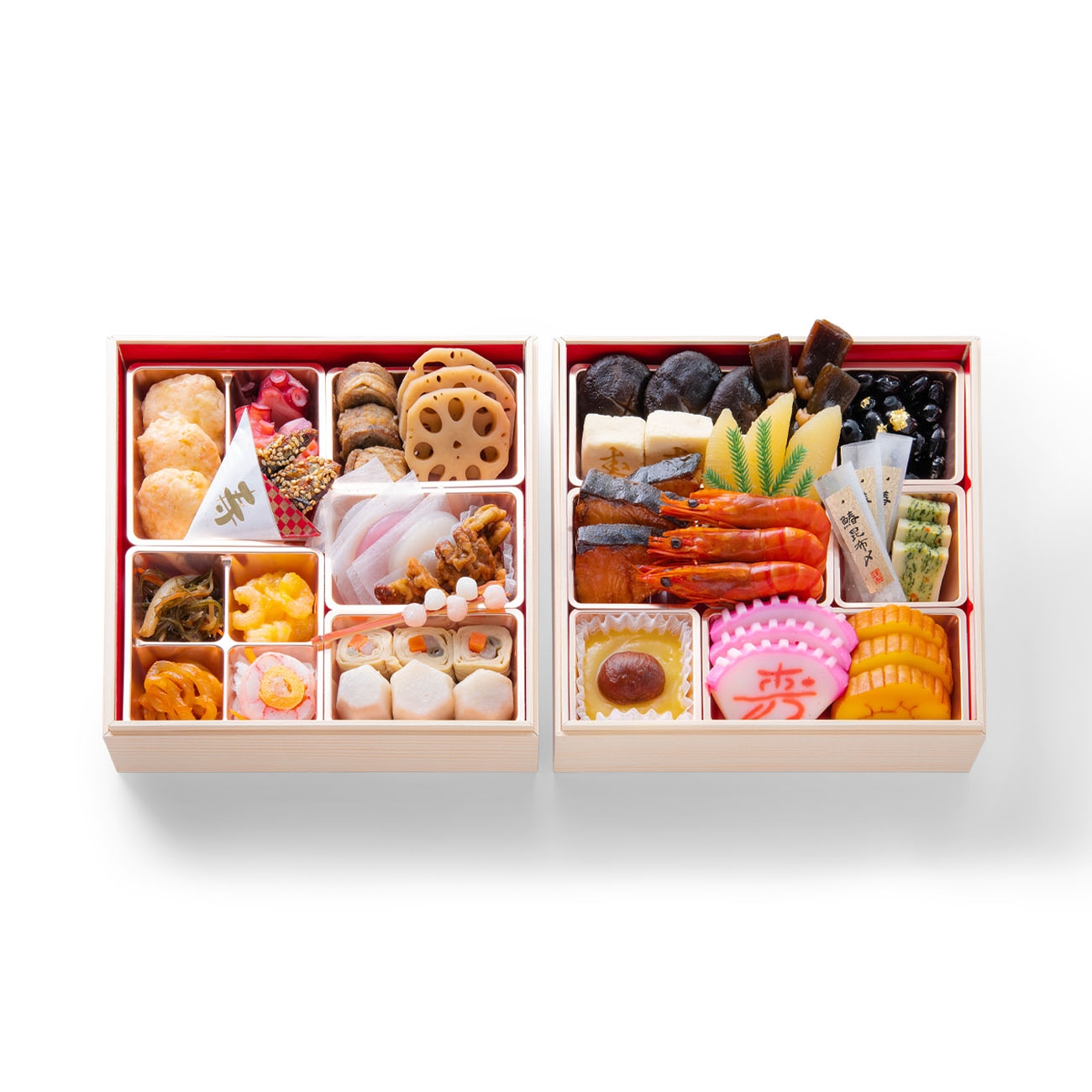 【壱の重】 海老の旨煮/ 鰤の照焼き/味付数の子/鰆昆布〆金箔紙包/博多高野ほうれん草/寿かまぼこ/伊達巻/鳴門芋きんとん/栗甘露煮/黒豆金箔飾り/寿高野煮/しいたけ煮 /昆布巻【弍の重】牛肉八幡巻き /甲いかうにかにみそ/ぷりぷり海老サラダ/いか刺し入りゴボウ昆布醬油漬け/わかごま/たこ梅じそ風味/海老新丈/くるみのキャラメリゼ/紅白葛羽衣/湯葉三色/六角里芋煮/れんこん煮/もち玉ちらし/紅白生酢/カニ水車巻